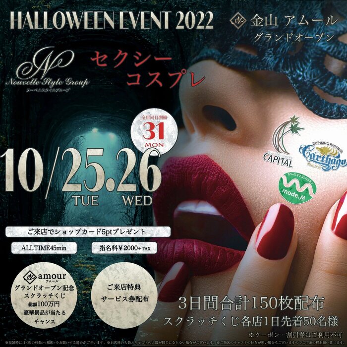 毎度ありがとうございます。2022年10月25㈫26㈬に蟹江カルタゴ、尾張旭キャピタル、犬山モードМの3店舗ハロウィンコスプレイベント開催します。期間中は全キャストセクシー&キュートなコスプレでお出迎え!この機会に是非共お気に入りの子をご指名ご来店ください。お待ちしております。