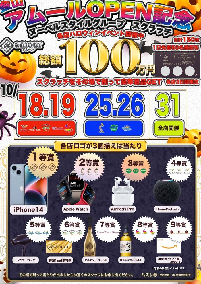 この度、金山に新店舗アムールOPENを記念して、ハロウィンイベント開催日当日先着50名様に賞品総額100万円の豪華景品が当たるスクラッチカードをお配りします。その場で当たる!1等賞は今話題のiPhone14が当たっちゃいます!!!是非ともご来店くださいませ。※イベント開催日は画像参照してください。お間違えのないようよろしくお願いいたします。