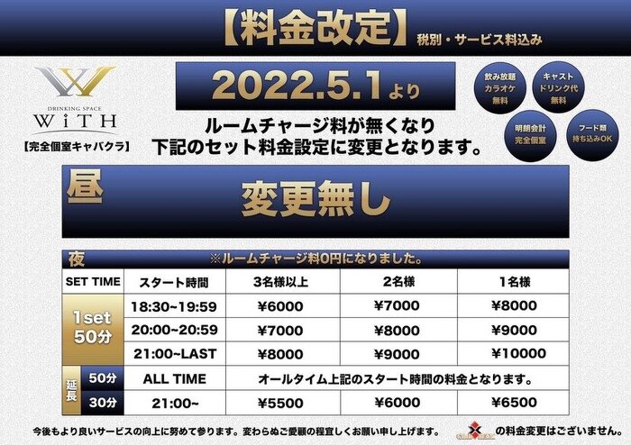 2022年5月1日より大曽根ウィズ【夜の部】料金改定いたします。 今まではセット料金とは別にルームチャージ料金を別途頂戴しておりましたが、 2022年5月1日より込みの料金に変更いたします。 今後共大曽根ウィズを宜しくお願い致します。